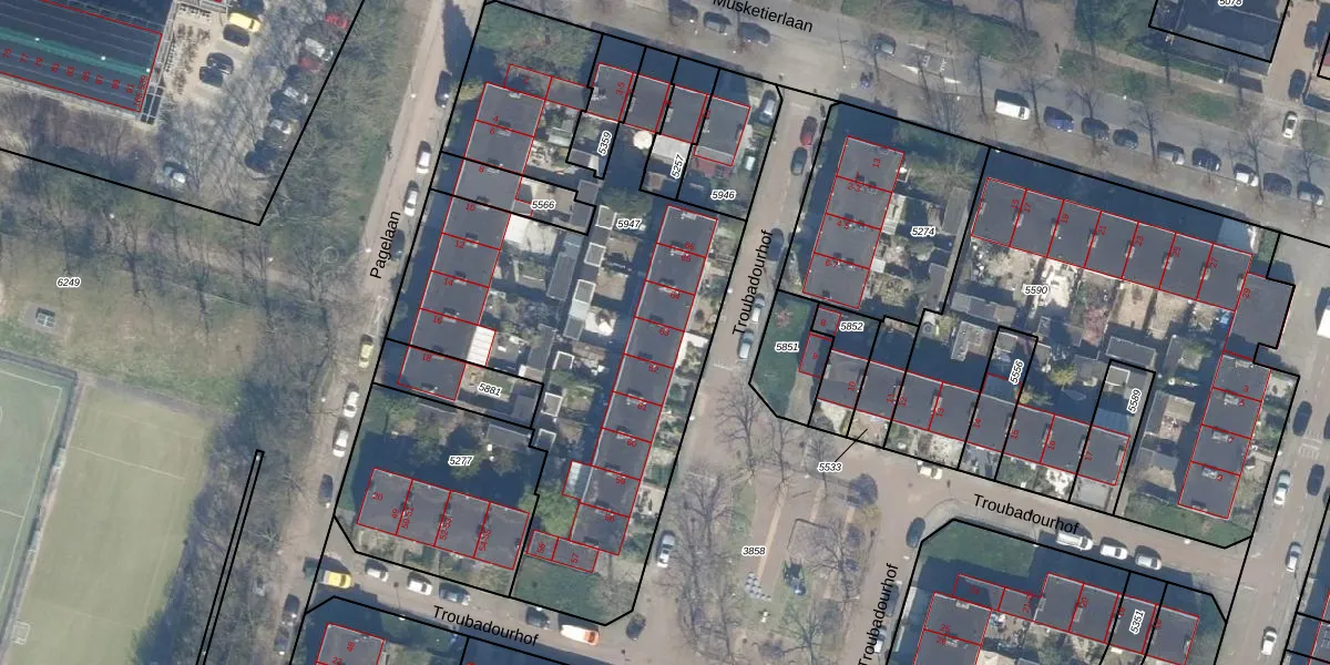 Het perceel waarop Troubadourhof 63 staat heeft een oppervlakte van 2510 m². Dit is een zeer groot perceel. De perceeloppervlakte wordt geregistreerd door het Kadaster. Gedetailleerde informatie over de maten van dit perceel kunt u vinden in het rapport Kadastrale kaart met maatvoering van Troubadourhof 63.