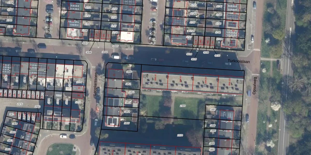 Het perceel waarop Turkooislaan 45 staat heeft een oppervlakte van 1965 m². Dit is een zeer groot perceel. De perceeloppervlakte wordt geregistreerd door het Kadaster. Gedetailleerde informatie over de maten van dit perceel kunt u vinden in het rapport Kadastrale kaart met maatvoering van Turkooislaan 45.