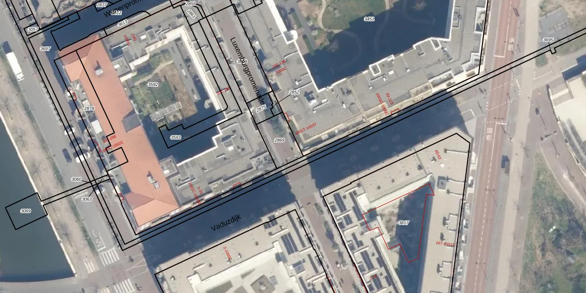 Vaduzdijk 39 is gelegen op kadastraal perceel CTR00F2869. Deze kadastrale aanduiding is uniek en wordt gebruikt door het Kadaster om eigendomsrechten en andere zakelijke rechten vast te leggen. Het perceel maakt onderdeel uit van de kadastrale gemeente Catharijne.