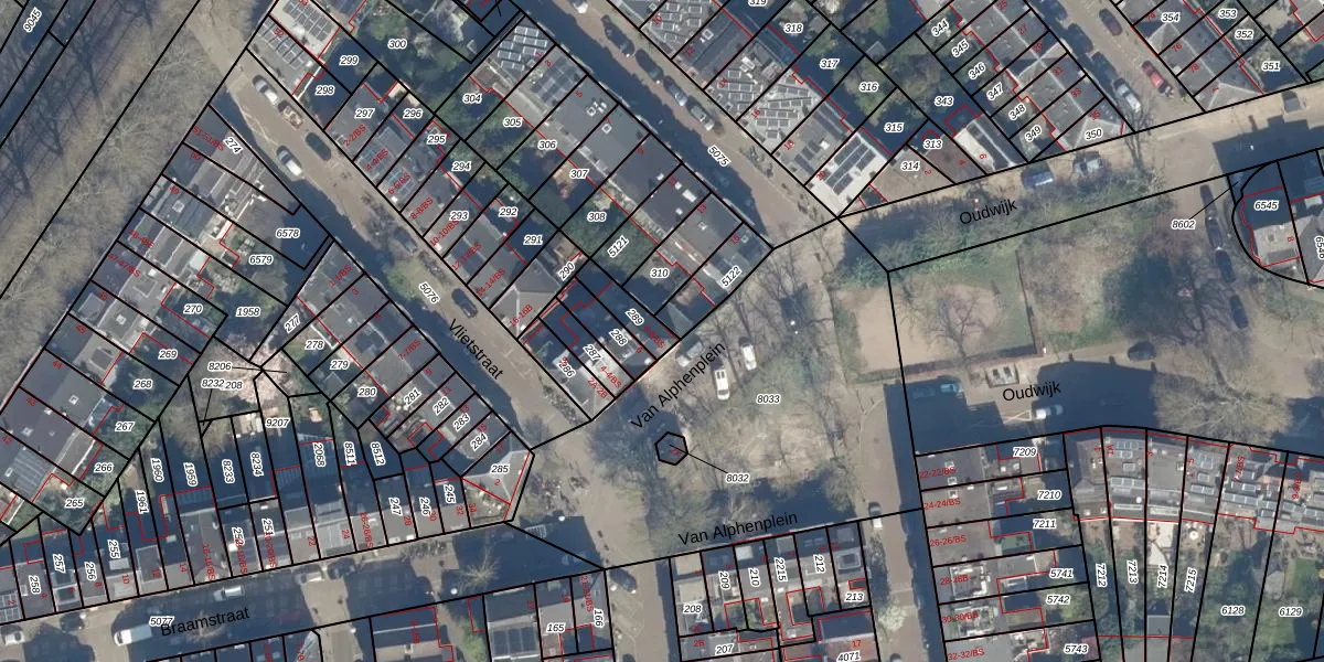 Het perceel waarop Van Alphenplein 8 staat heeft een oppervlakte van 87 m². Dit is een klein perceel. De perceeloppervlakte wordt geregistreerd door het Kadaster. Gedetailleerde informatie over de maten van dit perceel kunt u vinden in het rapport Kadastrale kaart met maatvoering van Van Alphenplein 8.