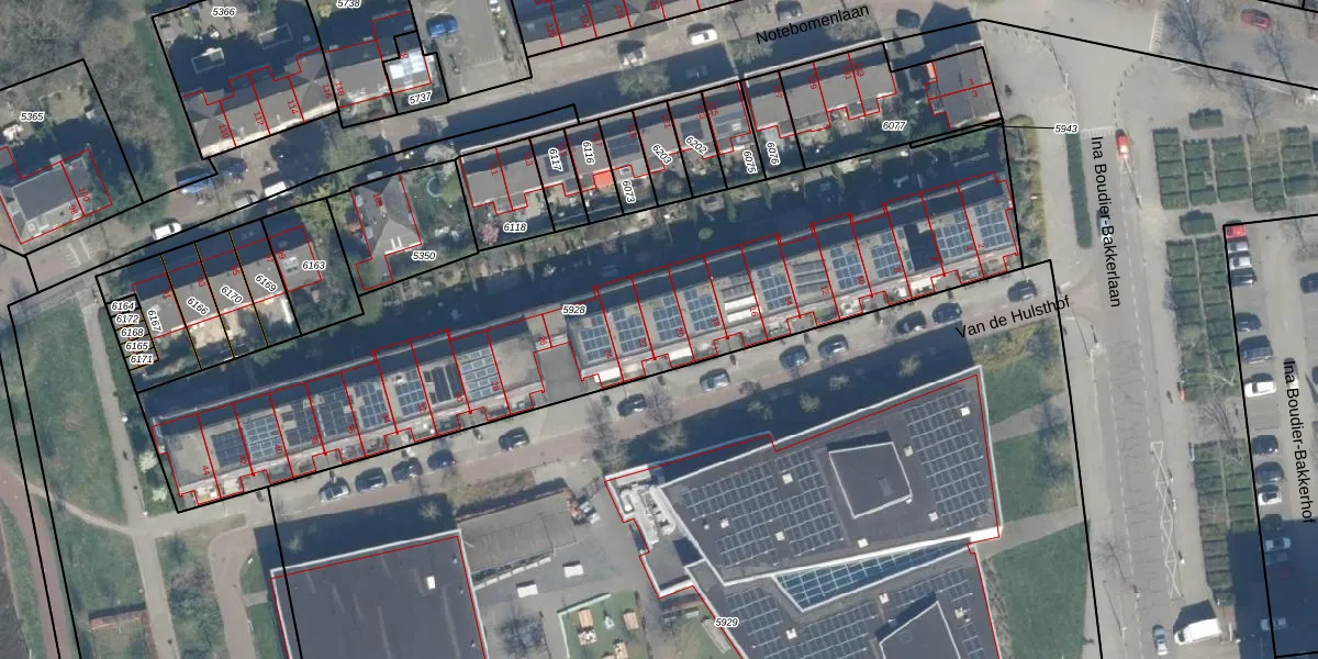 Het perceel waarop Van de Hulsthof 20 staat heeft een oppervlakte van 3115 m². Dit is een zeer groot perceel. De perceeloppervlakte wordt geregistreerd door het Kadaster. Gedetailleerde informatie over de maten van dit perceel kunt u vinden in het rapport Kadastrale kaart met maatvoering van Van de Hulsthof 20.