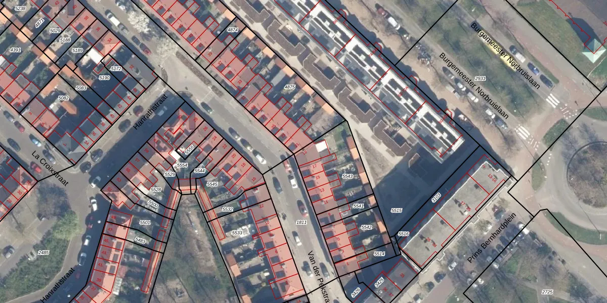 Het perceel waarop Van der Pekstraat 19 staat heeft een oppervlakte van 472 m². Dit is een groot perceel. De perceeloppervlakte wordt geregistreerd door het Kadaster. Gedetailleerde informatie over de maten van dit perceel kunt u vinden in het rapport Kadastrale kaart met maatvoering van Van der Pekstraat 19.