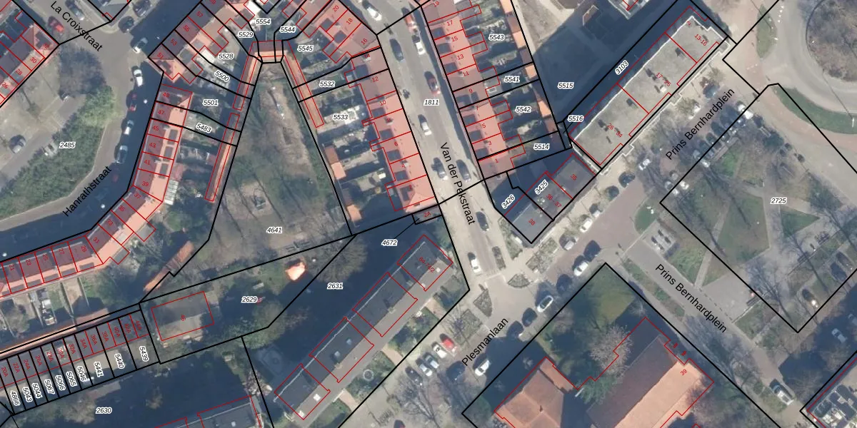 Gebruik de zoekbalk of klik op een perceel voor informatie over de adressen binnen dit perceel.