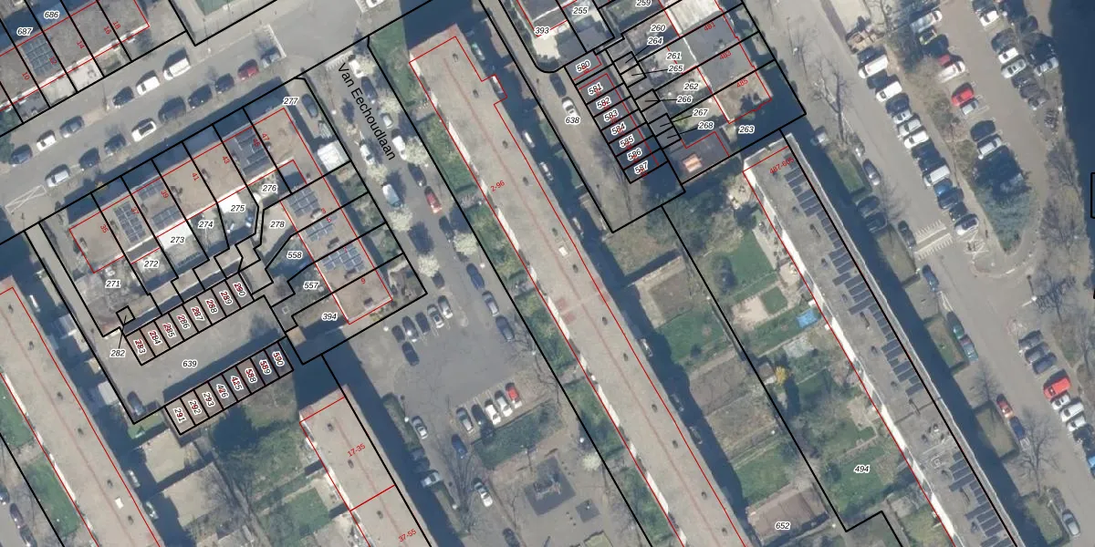 Het perceel waarop Van Eechoudlaan 40 staat heeft een oppervlakte van 3956 m². Dit is een zeer groot perceel. De perceeloppervlakte wordt geregistreerd door het Kadaster. Gedetailleerde informatie over de maten van dit perceel kunt u vinden in het rapport Kadastrale kaart met maatvoering van Van Eechoudlaan 40.