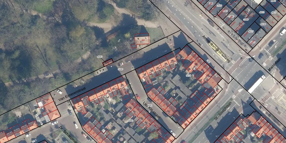 Het perceel waarop Van Eimerenstraat 6-BS staat heeft een oppervlakte van 2053 m². Dit is een zeer groot perceel. De perceeloppervlakte wordt geregistreerd door het Kadaster. Gedetailleerde informatie over de maten van dit perceel kunt u vinden in het rapport Kadastrale kaart met maatvoering van Van Eimerenstraat 6-BS.