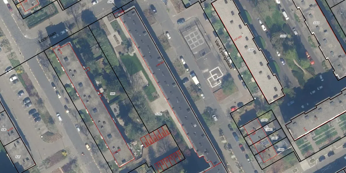 Het perceel waarop Van Eysingalaan 256 staat heeft een oppervlakte van 3206 m². Dit is een zeer groot perceel. De perceeloppervlakte wordt geregistreerd door het Kadaster. Gedetailleerde informatie over de maten van dit perceel kunt u vinden in het rapport Kadastrale kaart met maatvoering van Van Eysingalaan 256.