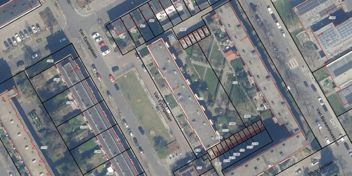 Het perceel waarop Van Eysingalaan 87 staat heeft een oppervlakte van 2173 m². Dit is een zeer groot perceel. De perceeloppervlakte wordt geregistreerd door het Kadaster. Gedetailleerde informatie over de maten van dit perceel kunt u vinden in het rapport Kadastrale kaart met maatvoering van Van Eysingalaan 87.