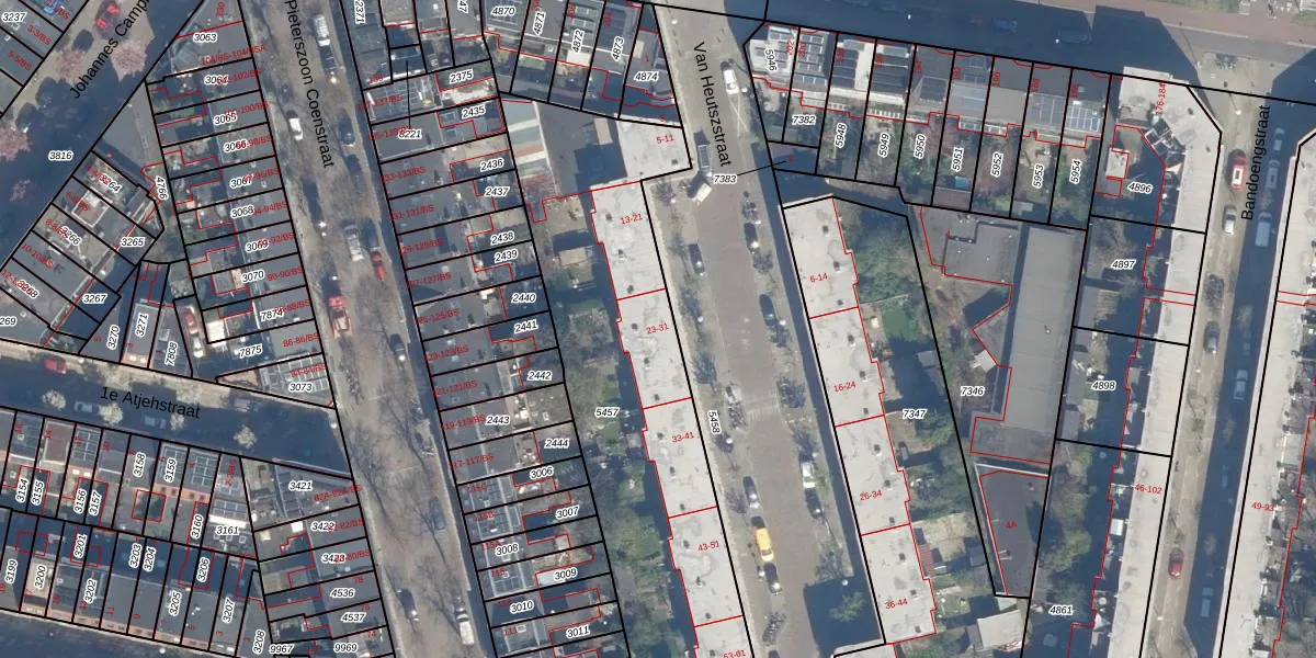 Het perceel waarop Van Heutszstraat 23 staat heeft een oppervlakte van 2195 m². Dit is een zeer groot perceel. De perceeloppervlakte wordt geregistreerd door het Kadaster. Gedetailleerde informatie over de maten van dit perceel kunt u vinden in het rapport Kadastrale kaart met maatvoering van Van Heutszstraat 23.
