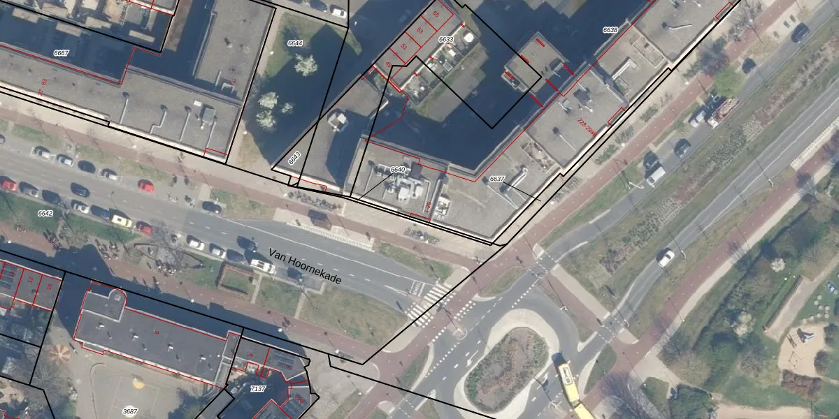 Het perceel waarop Van Hoornekade 23 staat heeft een oppervlakte van 6632 m². Dit is een zeer groot perceel. De perceeloppervlakte wordt geregistreerd door het Kadaster. Gedetailleerde informatie over de maten van dit perceel kunt u vinden in het rapport Kadastrale kaart met maatvoering van Van Hoornekade 23.