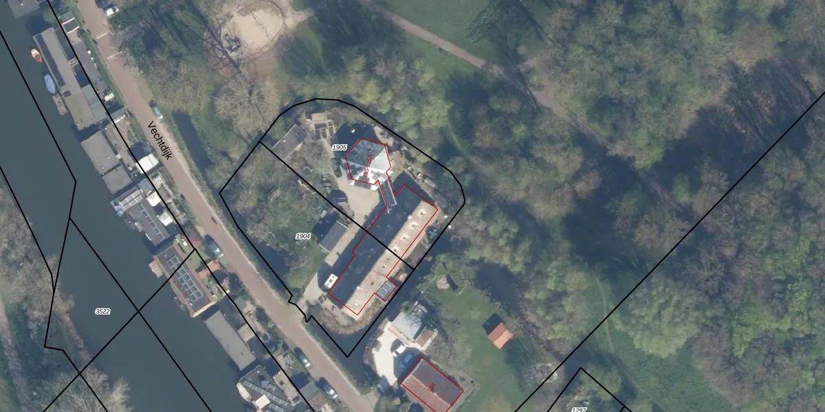 Het perceel waarop Vechtdijk 135-A staat heeft een oppervlakte van 1050 m². Dit is een zeer groot perceel. De perceeloppervlakte wordt geregistreerd door het Kadaster. Gedetailleerde informatie over de maten van dit perceel kunt u vinden in het rapport Kadastrale kaart met maatvoering van Vechtdijk 135-A.