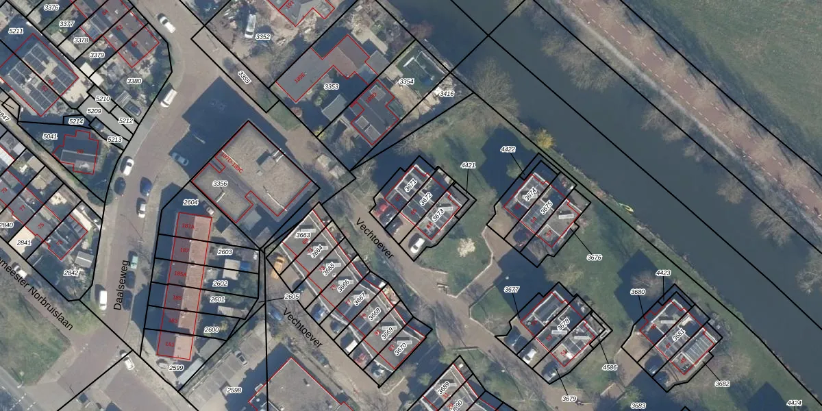 Vechtoever 65 is gelegen op kadastraal perceel ZLN02B3672. Deze kadastrale aanduiding is uniek en wordt gebruikt door het Kadaster om eigendomsrechten en andere zakelijke rechten vast te leggen. Het perceel maakt onderdeel uit van de kadastrale gemeente Zuilen.