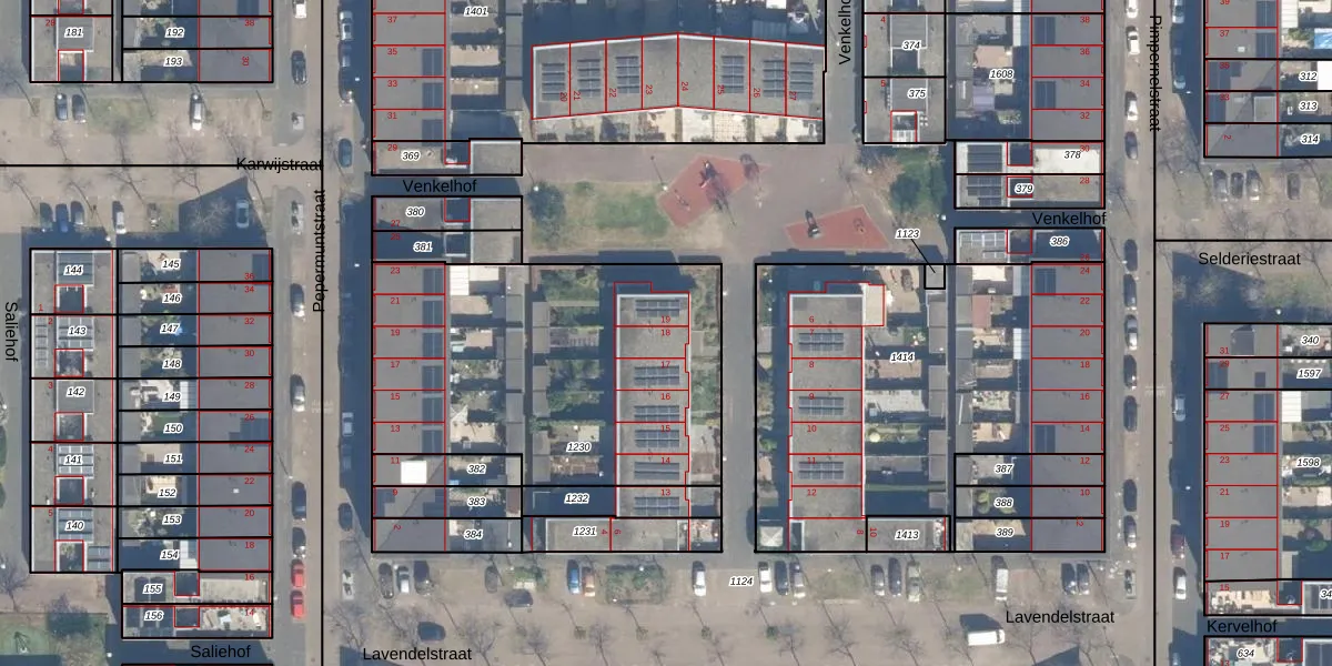 Het perceel waarop Venkelhof 18 staat heeft een oppervlakte van 1645 m². Dit is een zeer groot perceel. De perceeloppervlakte wordt geregistreerd door het Kadaster. Gedetailleerde informatie over de maten van dit perceel kunt u vinden in het rapport Kadastrale kaart met maatvoering van Venkelhof 18.