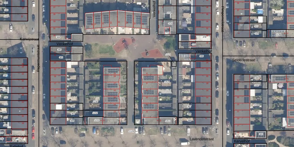 Het perceel waarop Venkelhof 6 staat heeft een oppervlakte van 1860 m². Dit is een zeer groot perceel. De perceeloppervlakte wordt geregistreerd door het Kadaster. Gedetailleerde informatie over de maten van dit perceel kunt u vinden in het rapport Kadastrale kaart met maatvoering van Venkelhof 6.