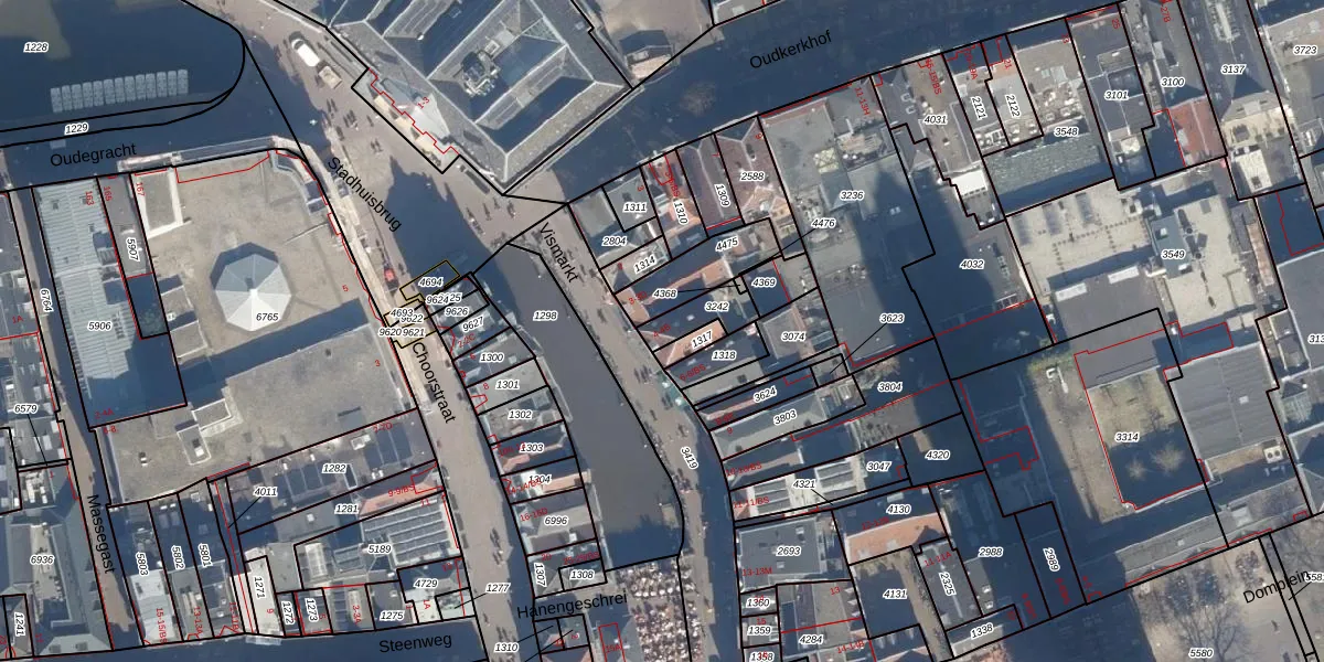 Het perceel waarop Vismarkt 4-A staat heeft een oppervlakte van 93 m². Dit is een klein perceel. De perceeloppervlakte wordt geregistreerd door het Kadaster. Gedetailleerde informatie over de maten van dit perceel kunt u vinden in het rapport Kadastrale kaart met maatvoering van Vismarkt 4-A.
