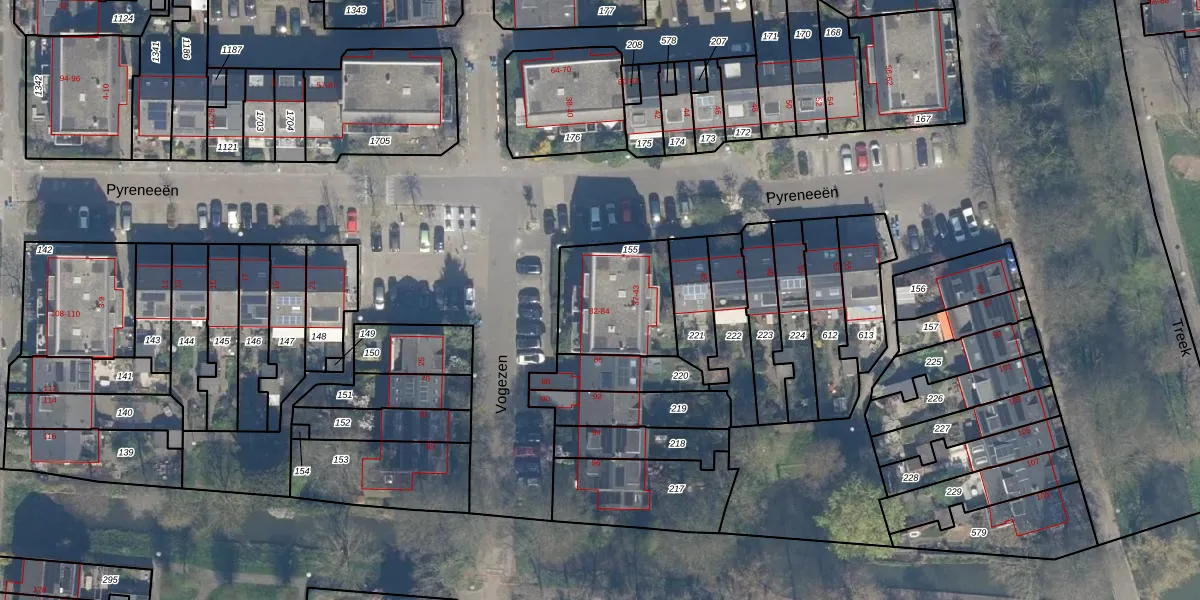 Het perceel waarop Vogezen 82 staat heeft een oppervlakte van 358 m². Dit is een groot perceel. De perceeloppervlakte wordt geregistreerd door het Kadaster. Gedetailleerde informatie over de maten van dit perceel kunt u vinden in het rapport Kadastrale kaart met maatvoering van Vogezen 82.