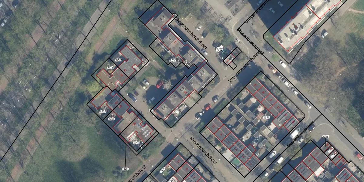 Het perceel waarop Vreuchdenberchdreef 87 staat heeft een oppervlakte van 1100 m². Dit is een zeer groot perceel. De perceeloppervlakte wordt geregistreerd door het Kadaster. Gedetailleerde informatie over de maten van dit perceel kunt u vinden in het rapport Kadastrale kaart met maatvoering van Vreuchdenberchdreef 87.