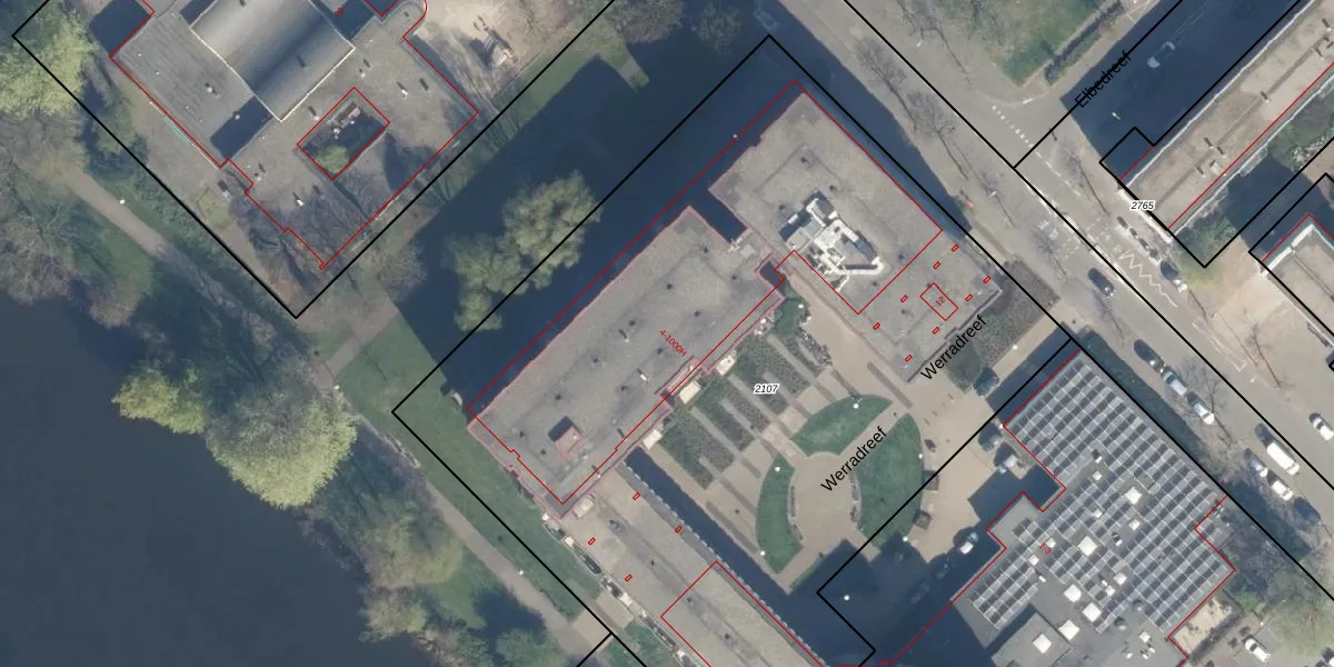 Het perceel waarop Werradreef 74 staat heeft een oppervlakte van 5450 m². Dit is een zeer groot perceel. De perceeloppervlakte wordt geregistreerd door het Kadaster. Gedetailleerde informatie over de maten van dit perceel kunt u vinden in het rapport Kadastrale kaart met maatvoering van Werradreef 74.