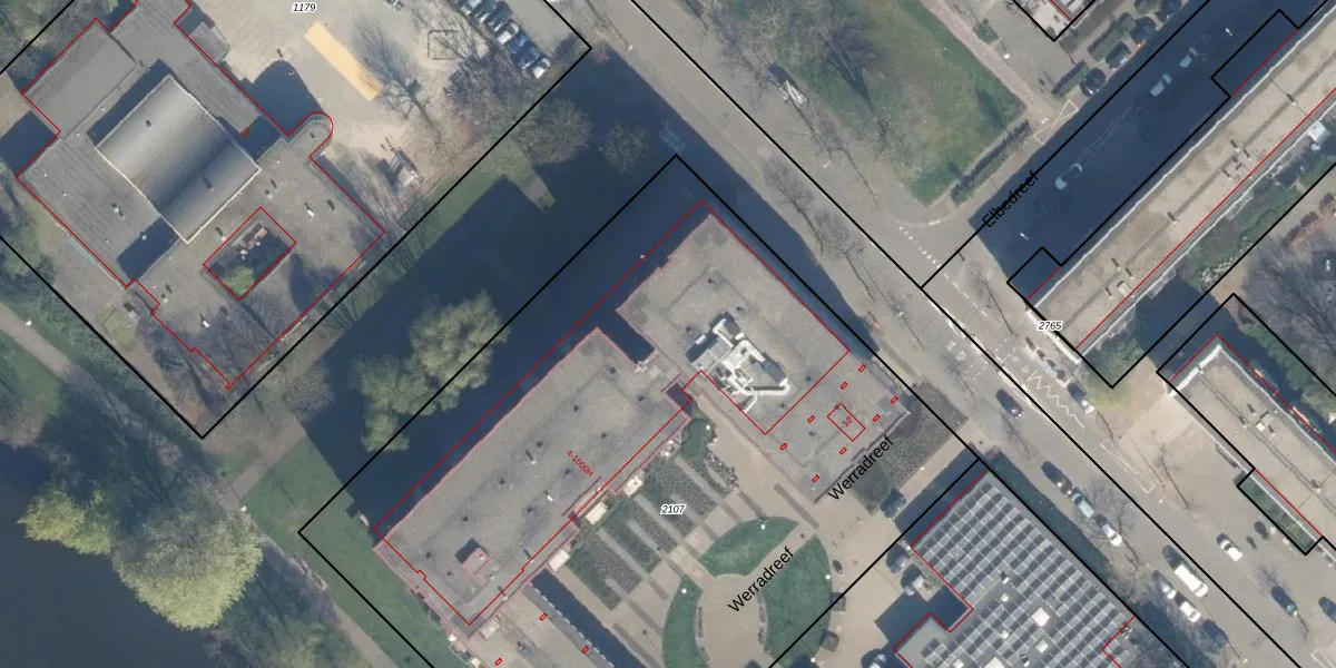 Het perceel waarop Werradreef 99 staat heeft een oppervlakte van 5450 m². Dit is een zeer groot perceel. De perceeloppervlakte wordt geregistreerd door het Kadaster. Gedetailleerde informatie over de maten van dit perceel kunt u vinden in het rapport Kadastrale kaart met maatvoering van Werradreef 99.