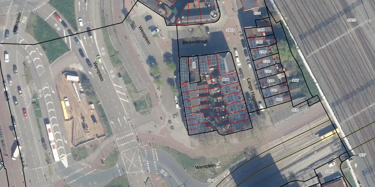 Het perceel waarop Westplein 106 staat heeft een oppervlakte van 1219 m². Dit is een zeer groot perceel. De perceeloppervlakte wordt geregistreerd door het Kadaster. Gedetailleerde informatie over de maten van dit perceel kunt u vinden in het rapport Kadastrale kaart met maatvoering van Westplein 106.