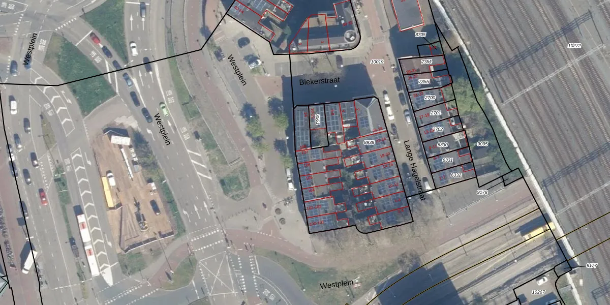 Het perceel waarop Westplein 107 staat heeft een oppervlakte van 1219 m². Dit is een zeer groot perceel. De perceeloppervlakte wordt geregistreerd door het Kadaster. Gedetailleerde informatie over de maten van dit perceel kunt u vinden in het rapport Kadastrale kaart met maatvoering van Westplein 107.
