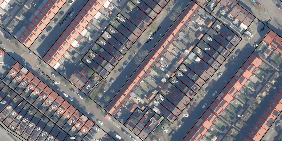 Het perceel waarop Wijnbesstraat 13 staat heeft een oppervlakte van 2964 m². Dit is een zeer groot perceel. De perceeloppervlakte wordt geregistreerd door het Kadaster. Gedetailleerde informatie over de maten van dit perceel kunt u vinden in het rapport Kadastrale kaart met maatvoering van Wijnbesstraat 13.
