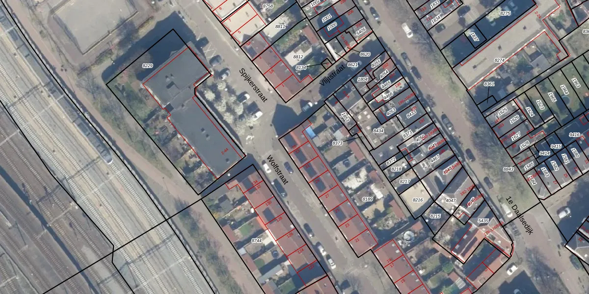 Het perceel waarop Wolfstraat 35 staat heeft een oppervlakte van 1960 m². Dit is een zeer groot perceel. De perceeloppervlakte wordt geregistreerd door het Kadaster. Gedetailleerde informatie over de maten van dit perceel kunt u vinden in het rapport Kadastrale kaart met maatvoering van Wolfstraat 35.