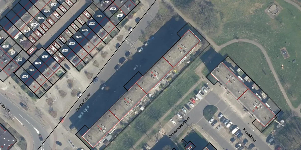 Het perceel waarop Zambesidreef 32 staat heeft een oppervlakte van 1878 m². Dit is een zeer groot perceel. De perceeloppervlakte wordt geregistreerd door het Kadaster. Gedetailleerde informatie over de maten van dit perceel kunt u vinden in het rapport Kadastrale kaart met maatvoering van Zambesidreef 32.