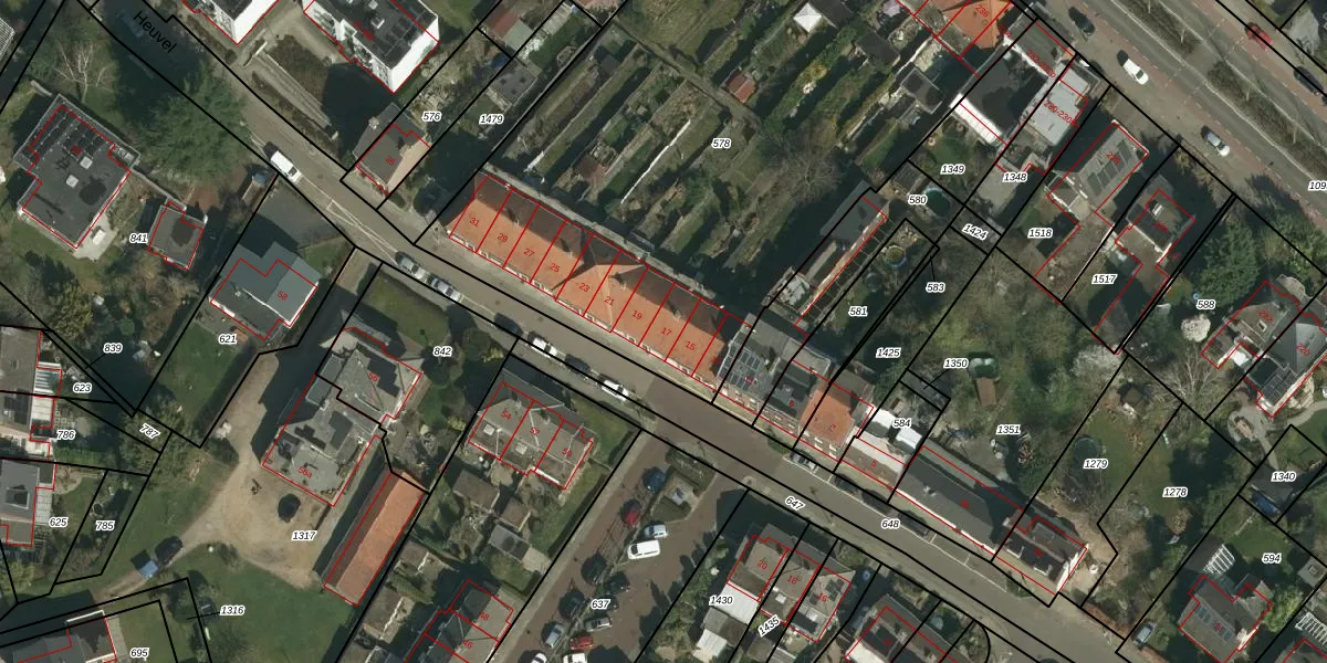 Het perceel waarop Heuvel 17 staat heeft een oppervlakte van 3855 m². Dit is een zeer groot perceel. De perceeloppervlakte wordt geregistreerd door het Kadaster. Gedetailleerde informatie over de maten van dit perceel kunt u vinden in het rapport Kadastrale kaart met maatvoering van Heuvel 17.