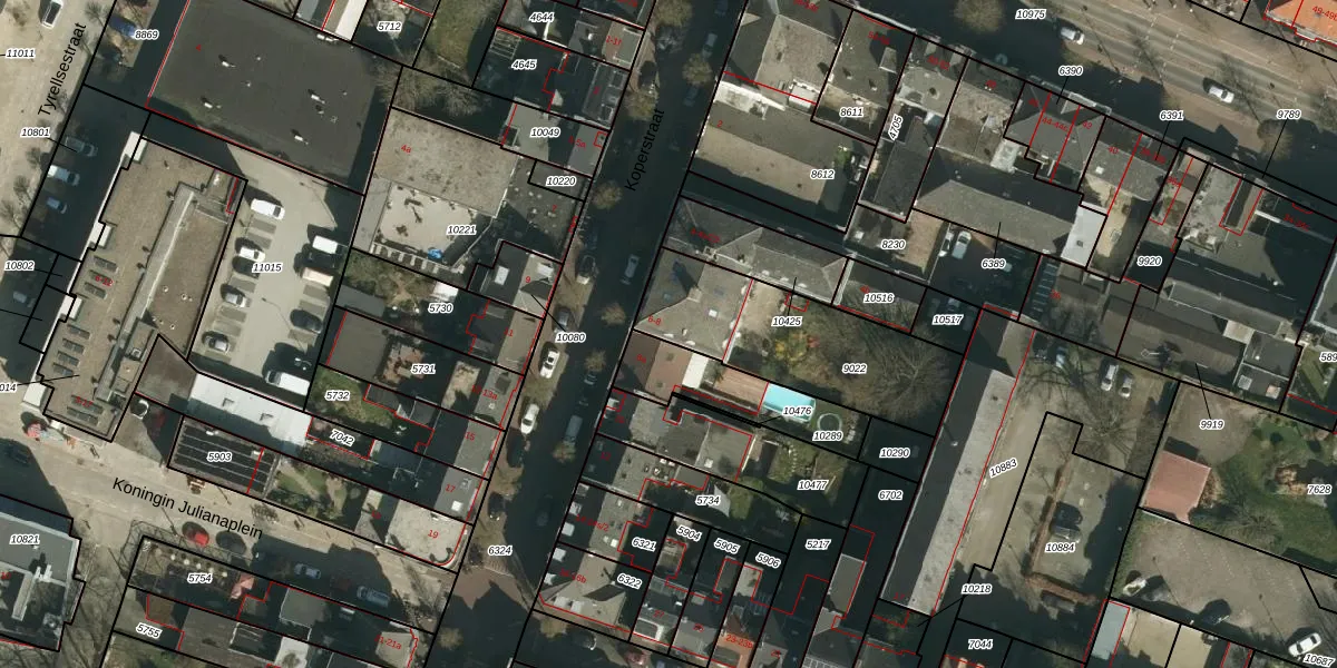 Het perceel waarop Koperstraat 6-j staat heeft een oppervlakte van 635 m². Dit is een groot perceel. De perceeloppervlakte wordt geregistreerd door het Kadaster. Gedetailleerde informatie over de maten van dit perceel kunt u vinden in het rapport Kadastrale kaart met maatvoering van Koperstraat 6-j.