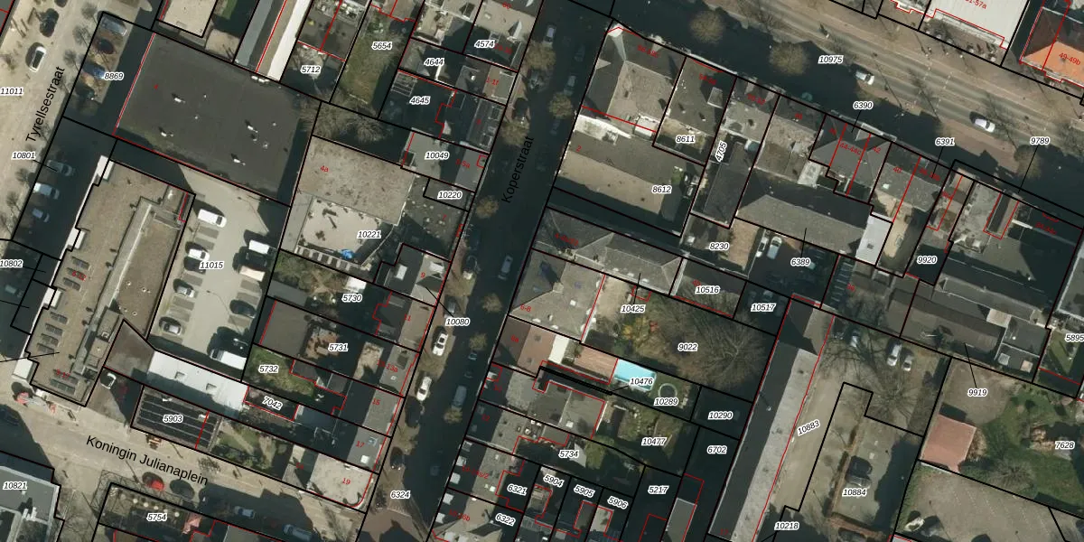 Het perceel waarop Koperstraat 6-k staat heeft een oppervlakte van 635 m². Dit is een groot perceel. De perceeloppervlakte wordt geregistreerd door het Kadaster. Gedetailleerde informatie over de maten van dit perceel kunt u vinden in het rapport Kadastrale kaart met maatvoering van Koperstraat 6-k.
