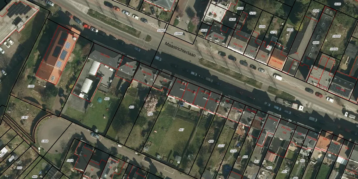 Het perceel waarop Maastrichterlaan 150-b staat heeft een oppervlakte van 1374 m². Dit is een zeer groot perceel. De perceeloppervlakte wordt geregistreerd door het Kadaster. Gedetailleerde informatie over de maten van dit perceel kunt u vinden in het rapport Kadastrale kaart met maatvoering van Maastrichterlaan 150-b.