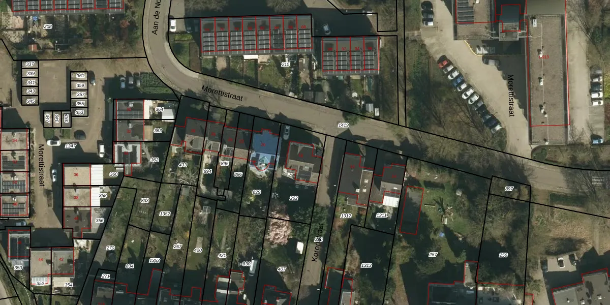 Het perceel waarop Morettistraat 18 staat heeft een oppervlakte van 455 m². Dit is een groot perceel. De perceeloppervlakte wordt geregistreerd door het Kadaster. Gedetailleerde informatie over de maten van dit perceel kunt u vinden in het rapport Kadastrale kaart met maatvoering van Morettistraat 18.