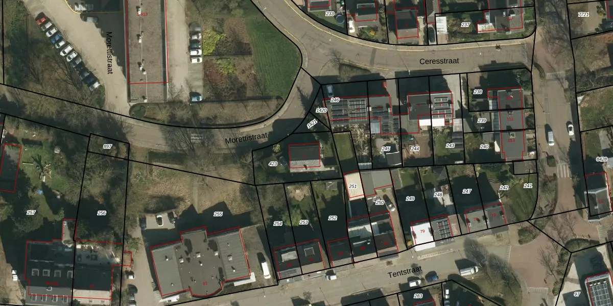 Het perceel waarop Morettistraat 2 staat heeft een oppervlakte van 400 m². Dit is een groot perceel. De perceeloppervlakte wordt geregistreerd door het Kadaster. Gedetailleerde informatie over de maten van dit perceel kunt u vinden in het rapport Kadastrale kaart met maatvoering van Morettistraat 2.
