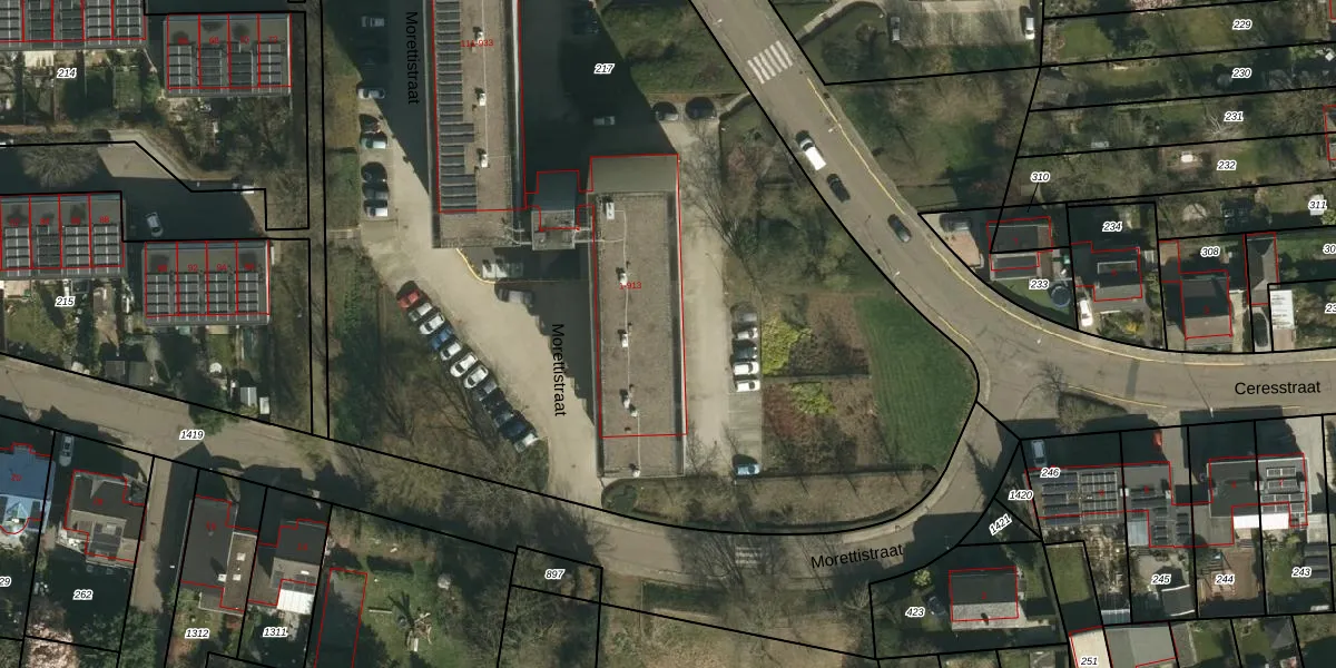 Het perceel waarop Morettistraat 47 staat heeft een oppervlakte van 8100 m². Dit is een zeer groot perceel. De perceeloppervlakte wordt geregistreerd door het Kadaster. Gedetailleerde informatie over de maten van dit perceel kunt u vinden in het rapport Kadastrale kaart met maatvoering van Morettistraat 47.