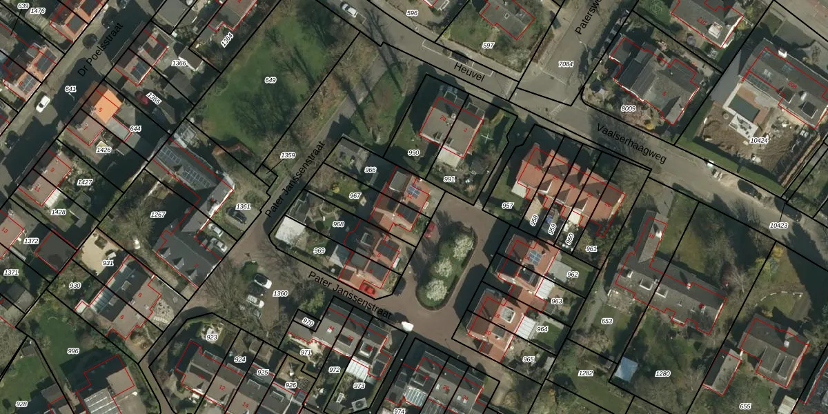 Pater Janssenstraat 12 is gelegen op kadastraal perceel VAA00E966. Deze kadastrale aanduiding is uniek en wordt gebruikt door het Kadaster om eigendomsrechten en andere zakelijke rechten vast te leggen. Het perceel maakt onderdeel uit van de kadastrale gemeente Vaals.