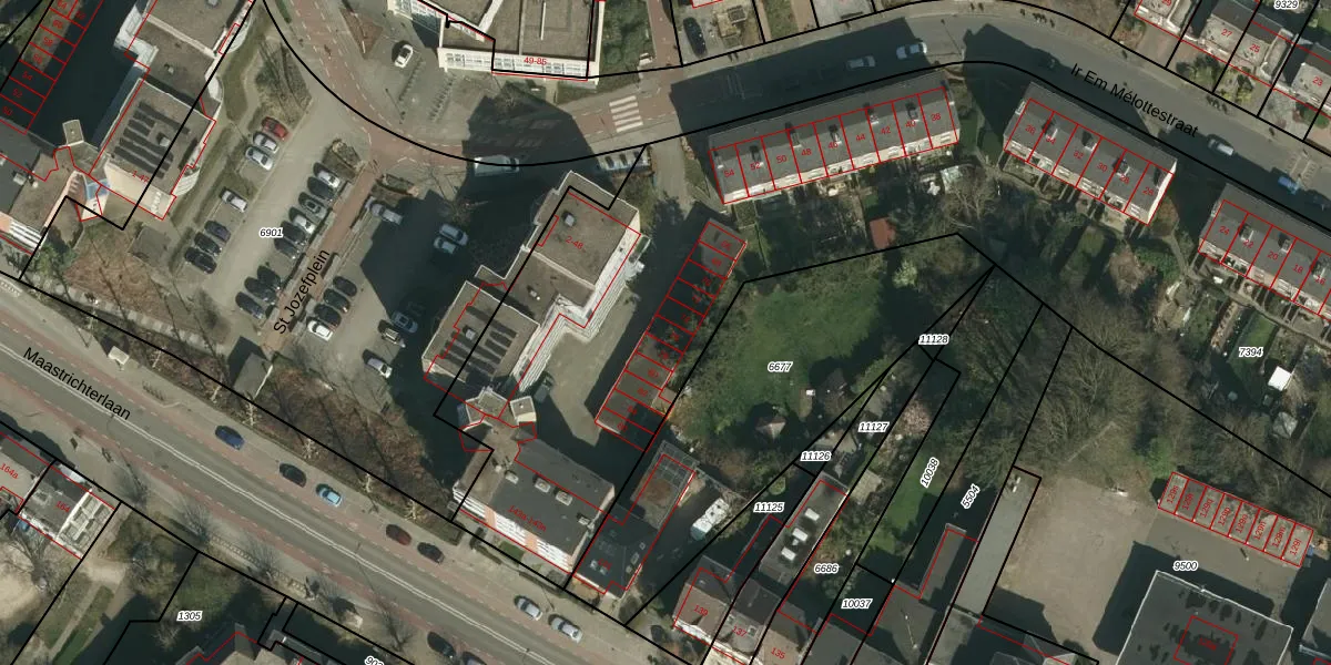 Het perceel waarop St Jozefplein 76 staat heeft een oppervlakte van 5859 m². Dit is een zeer groot perceel. De perceeloppervlakte wordt geregistreerd door het Kadaster. Gedetailleerde informatie over de maten van dit perceel kunt u vinden in het rapport Kadastrale kaart met maatvoering van St Jozefplein 76.