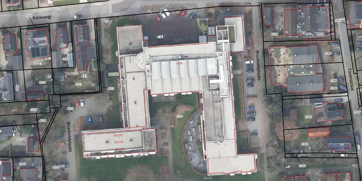 Het perceel waarop Brunholdplaats 13 staat heeft een oppervlakte van 1,3 ha. Dit is een zeer groot perceel. De perceeloppervlakte wordt geregistreerd door het Kadaster. Gedetailleerde informatie over de maten van dit perceel kunt u vinden in het rapport Kadastrale kaart met maatvoering van Brunholdplaats 13.