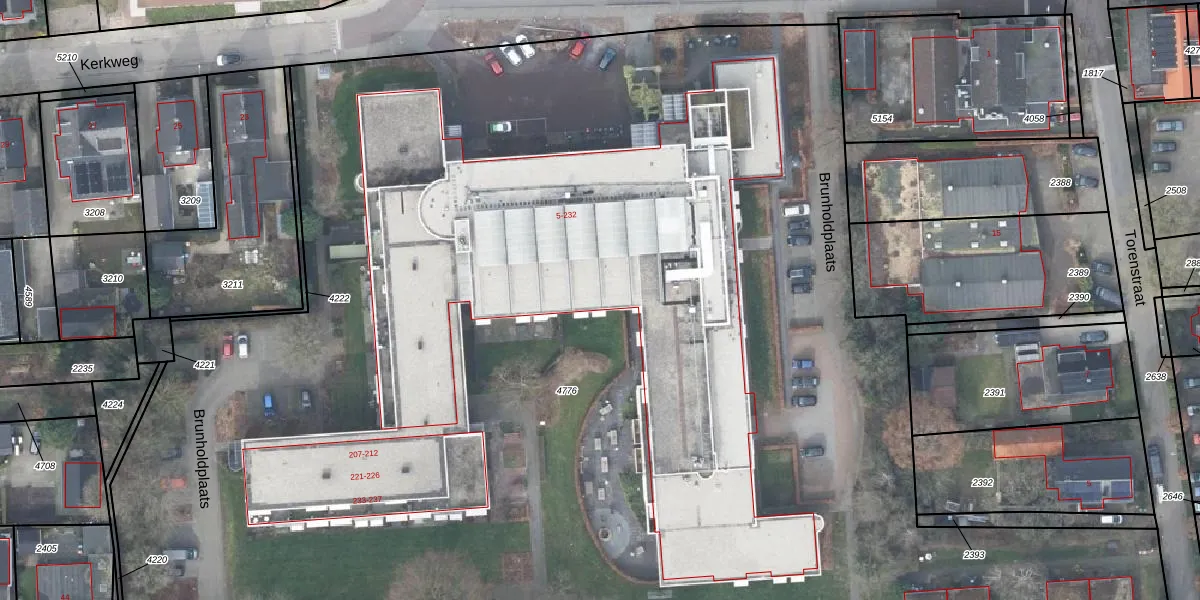 Het perceel waarop Brunholdplaats 14 staat heeft een oppervlakte van 1,3 ha. Dit is een zeer groot perceel. De perceeloppervlakte wordt geregistreerd door het Kadaster. Gedetailleerde informatie over de maten van dit perceel kunt u vinden in het rapport Kadastrale kaart met maatvoering van Brunholdplaats 14.