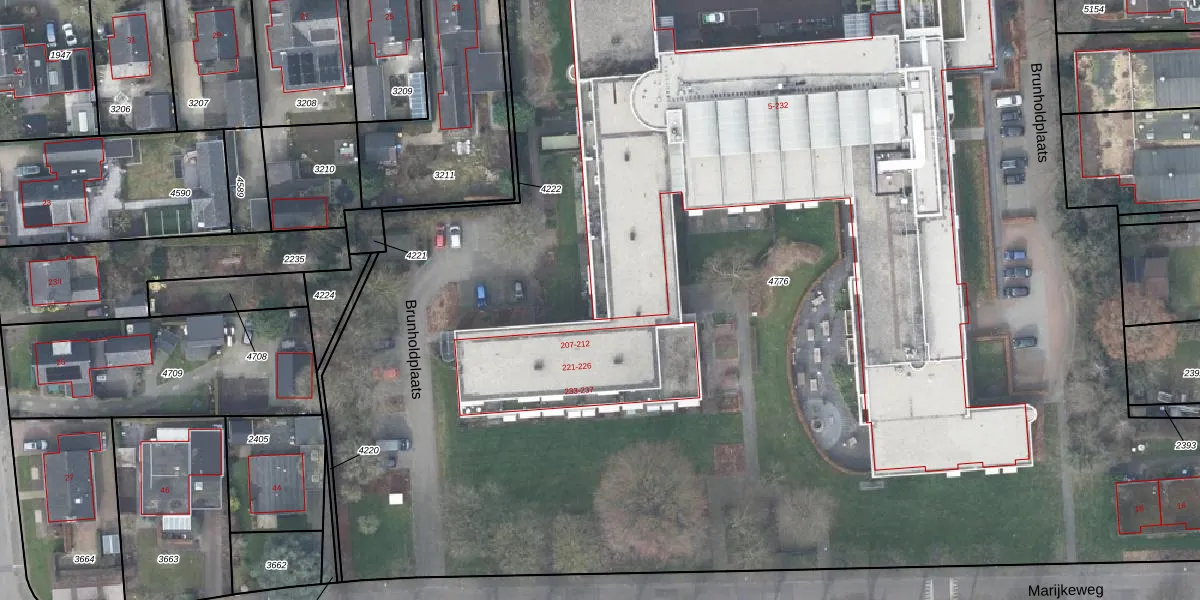 Het perceel waarop Brunholdplaats 206 staat heeft een oppervlakte van 1,3 ha. Dit is een zeer groot perceel. De perceeloppervlakte wordt geregistreerd door het Kadaster. Gedetailleerde informatie over de maten van dit perceel kunt u vinden in het rapport Kadastrale kaart met maatvoering van Brunholdplaats 206.