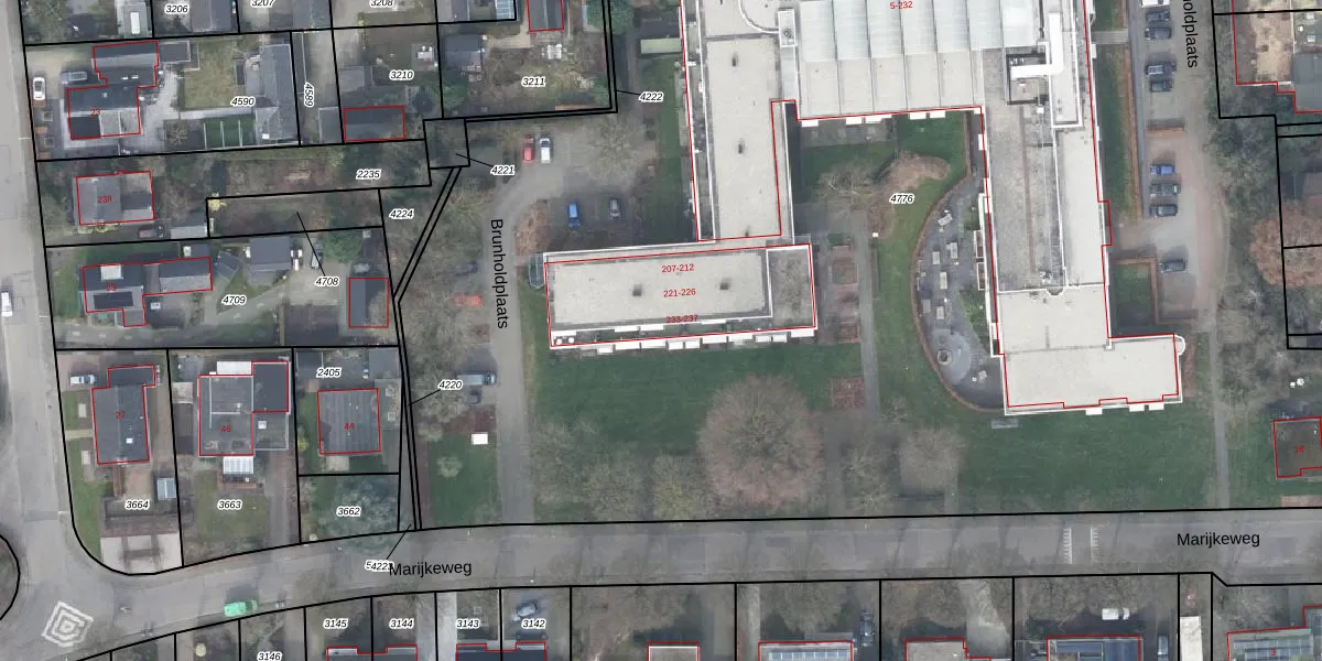 Het perceel waarop Brunholdplaats 210 staat heeft een oppervlakte van 1,3 ha. Dit is een zeer groot perceel. De perceeloppervlakte wordt geregistreerd door het Kadaster. Gedetailleerde informatie over de maten van dit perceel kunt u vinden in het rapport Kadastrale kaart met maatvoering van Brunholdplaats 210.