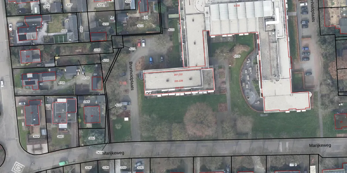 Het perceel waarop Brunholdplaats 224 staat heeft een oppervlakte van 1,3 ha. Dit is een zeer groot perceel. De perceeloppervlakte wordt geregistreerd door het Kadaster. Gedetailleerde informatie over de maten van dit perceel kunt u vinden in het rapport Kadastrale kaart met maatvoering van Brunholdplaats 224.