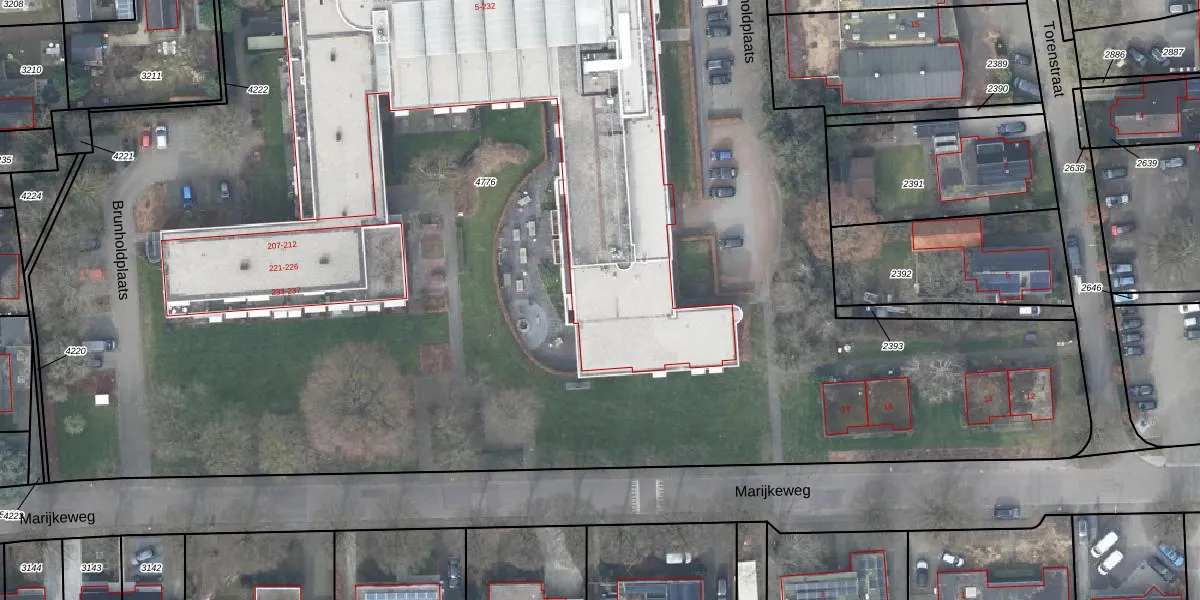 Het perceel waarop Brunholdplaats 47 staat heeft een oppervlakte van 1,3 ha. Dit is een zeer groot perceel. De perceeloppervlakte wordt geregistreerd door het Kadaster. Gedetailleerde informatie over de maten van dit perceel kunt u vinden in het rapport Kadastrale kaart met maatvoering van Brunholdplaats 47.