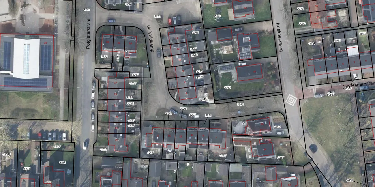 Het perceel waarop de Veldkamp 4 staat heeft een oppervlakte van 199 m². Dit is een middelgroot perceel. De perceeloppervlakte wordt geregistreerd door het Kadaster. Gedetailleerde informatie over de maten van dit perceel kunt u vinden in het rapport Kadastrale kaart met maatvoering van de Veldkamp 4.
