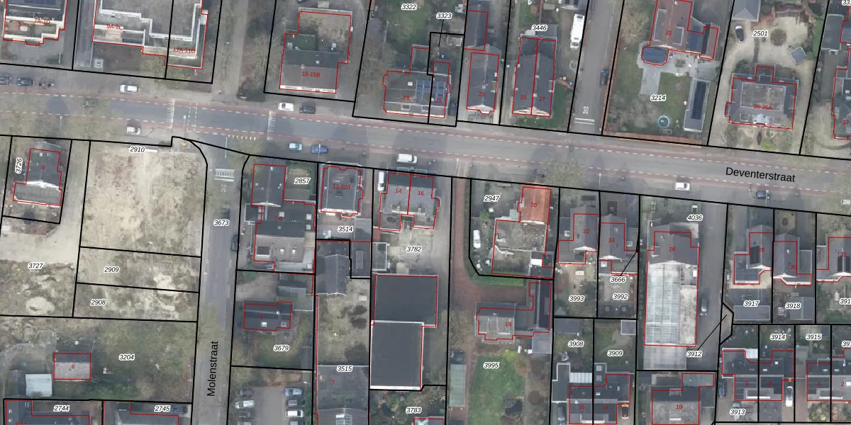 Het perceel waarop Deventerstraat 16 staat heeft een oppervlakte van 966 m². Dit is een groot perceel. De perceeloppervlakte wordt geregistreerd door het Kadaster. Gedetailleerde informatie over de maten van dit perceel kunt u vinden in het rapport Kadastrale kaart met maatvoering van Deventerstraat 16.