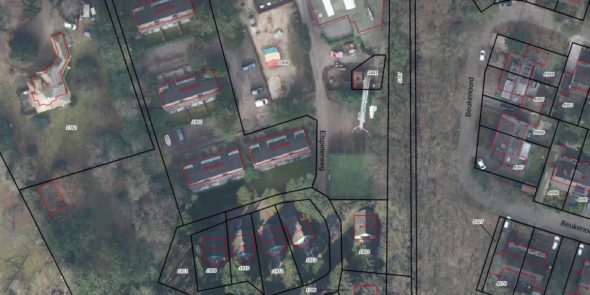 Het perceel waarop Elspeterweg 45-16 staat heeft een oppervlakte van 2875 m². Dit is een zeer groot perceel. De perceeloppervlakte wordt geregistreerd door het Kadaster. Gedetailleerde informatie over de maten van dit perceel kunt u vinden in het rapport Kadastrale kaart met maatvoering van Elspeterweg 45-16.