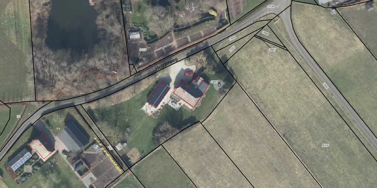 Het perceel waarop Heggerweg 19 staat heeft een oppervlakte van 2432 m². Dit is een zeer groot perceel. De perceeloppervlakte wordt geregistreerd door het Kadaster. Gedetailleerde informatie over de maten van dit perceel kunt u vinden in het rapport Kadastrale kaart met maatvoering van Heggerweg 19.