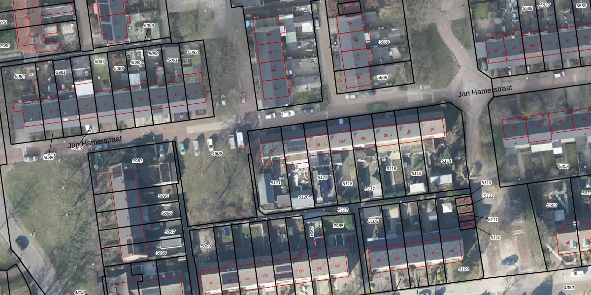 Het perceel waarop Jan Hamerstraat 22 staat heeft een oppervlakte van 226 m². Dit is een middelgroot perceel. De perceeloppervlakte wordt geregistreerd door het Kadaster. Gedetailleerde informatie over de maten van dit perceel kunt u vinden in het rapport Kadastrale kaart met maatvoering van Jan Hamerstraat 22.