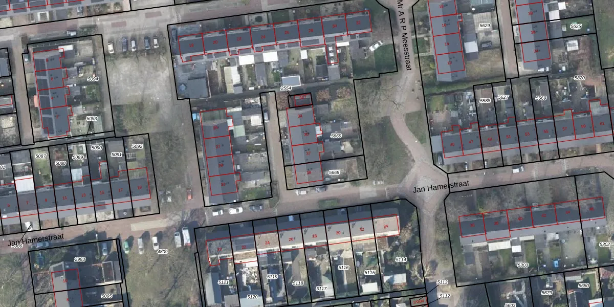 Het perceel waarop Jan Hamerstraat 37 staat heeft een oppervlakte van 3218 m². Dit is een zeer groot perceel. De perceeloppervlakte wordt geregistreerd door het Kadaster. Gedetailleerde informatie over de maten van dit perceel kunt u vinden in het rapport Kadastrale kaart met maatvoering van Jan Hamerstraat 37.