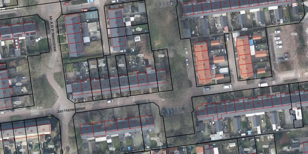 Het perceel waarop Jan Hamerstraat 61 staat heeft een oppervlakte van 973 m². Dit is een groot perceel. De perceeloppervlakte wordt geregistreerd door het Kadaster. Gedetailleerde informatie over de maten van dit perceel kunt u vinden in het rapport Kadastrale kaart met maatvoering van Jan Hamerstraat 61.