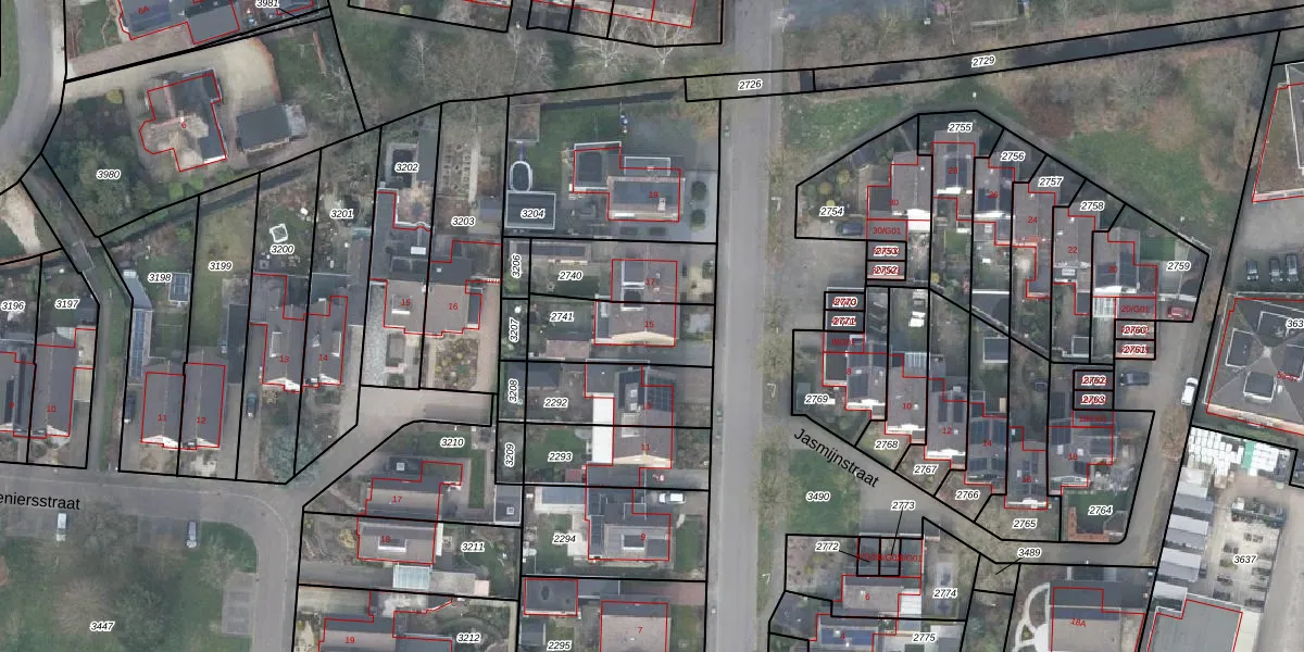 Het perceel waarop Jasmijnstraat 15 staat heeft een oppervlakte van 277 m². Dit is een middelgroot perceel. De perceeloppervlakte wordt geregistreerd door het Kadaster. Gedetailleerde informatie over de maten van dit perceel kunt u vinden in het rapport Kadastrale kaart met maatvoering van Jasmijnstraat 15.